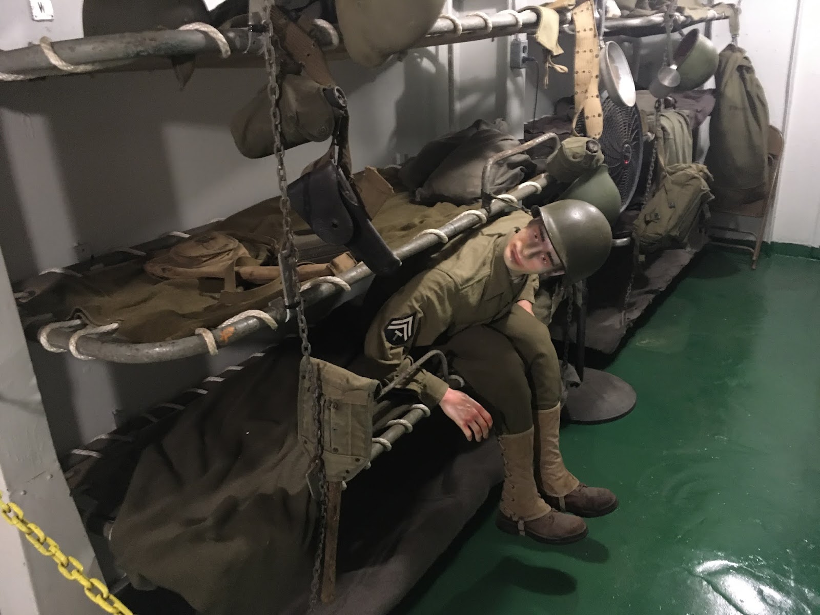 This resulted in a large amount of seasickness. He told us that the people that were stuck on the bottom bunks were in a terrible place if the people on the top bunks were seasick, and that soon, everyone would be covered with vomit and the place smelled terrible, just making things worse. He also said that it was not uncommon to have several inches of vomit sloshing up and down the hallway.